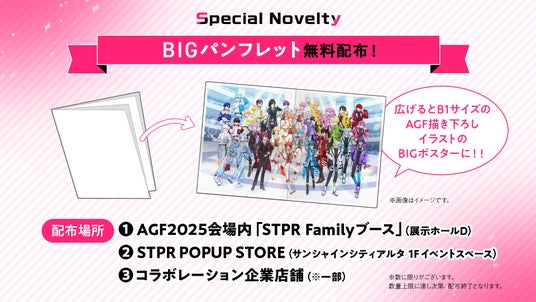 AGF2025に初出展するSTPRは、今回、メイン会場で最大規模のブースを展開します。ブースでは、グッズの先行販売をはじめ、展示やオリジナルノベルティ配布を実施。さらに、サンシャインシティ 噴水広場のオープンステージでは、STPR Familyから「めておら - Meteorites -」によるスペシャルステージも予定されています。AGF2025への出展にあわせ、サンシャインシティアルタにて「STPR POP UP STORE」もオープンし、会場と連動した特別な企画を展開します。